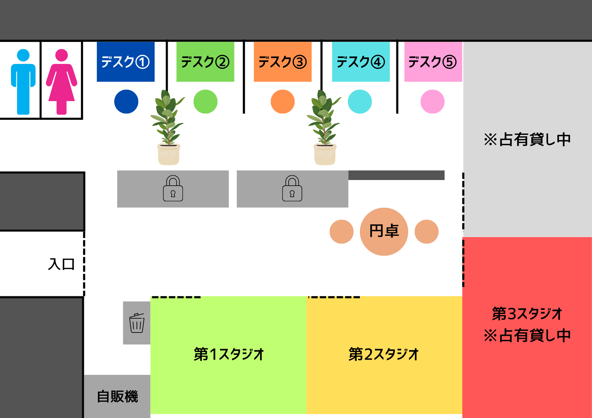 リコネクトスタジオでは、共用スペースエリアに5つのデスクをご用意しています。